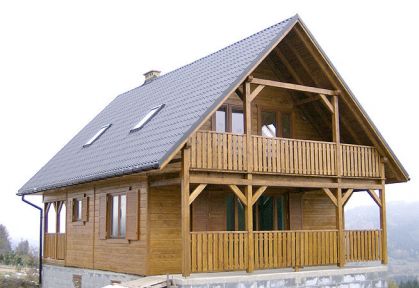 Cała konstrukcja jest czterostronnie strugana i impregnowana w klasie C24. Okładzina zewnętrzna jest wykonana z deski 3cm X 20cm z świerka Istebniaskiego. Dom mieszkalny jest wykonany z drewna świerkowego. Dom jest bardzo dobrze ocieplony wełną mineralną ISOVER, ściany, płyta, poddasze i podłogi wałek. Wnętrze domu jest wykończone drewnem lub płyta karton-gips. Pod karton-gips jest kręcona płyta osb 1,20cm jako stelaż i dodatkowe ocieplenie również wzmocnienie konstrukcji. Dach jest pokryty blachodachówką.